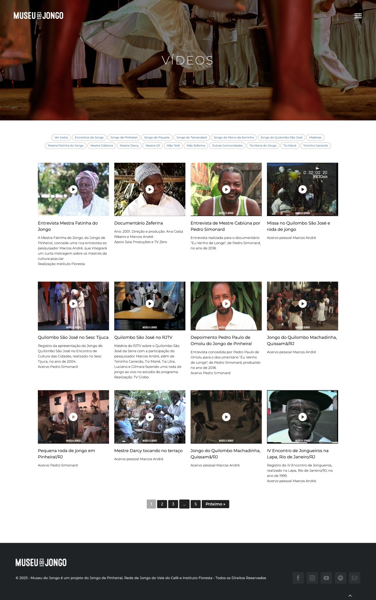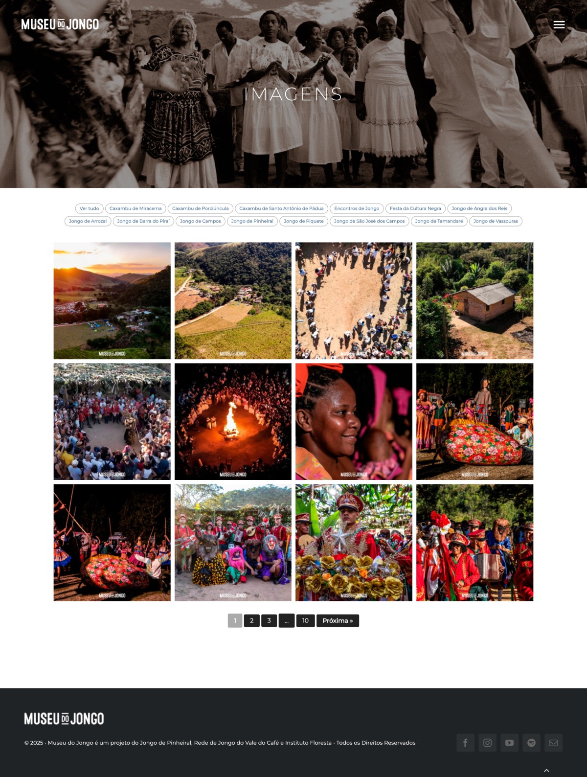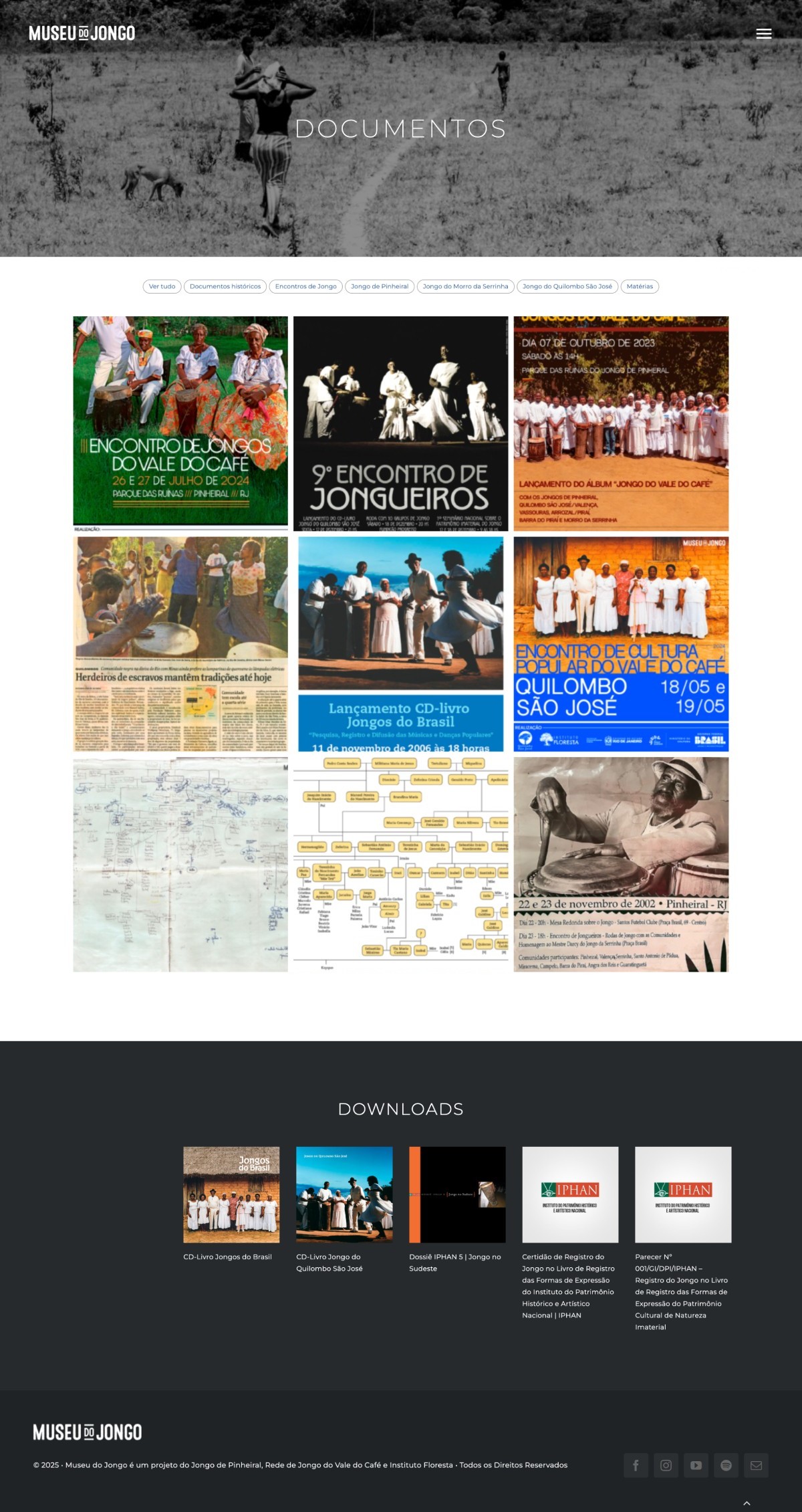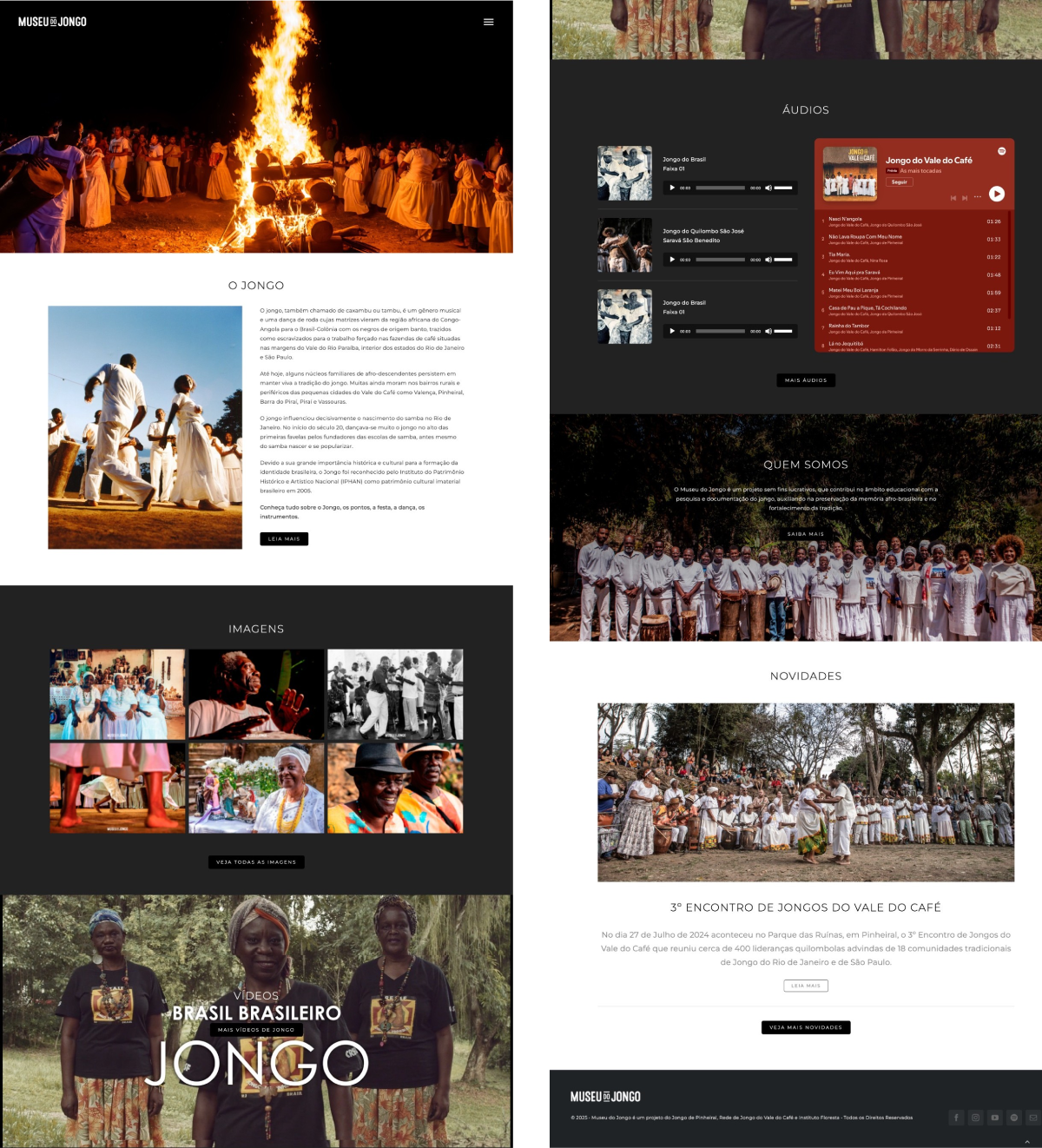 The visual design is elegant, with strong contrast between light and dark areas, highlighting images and videos. We aimed to visually represent the ancestry and symbolic strength of Jongo without relying on clichés.