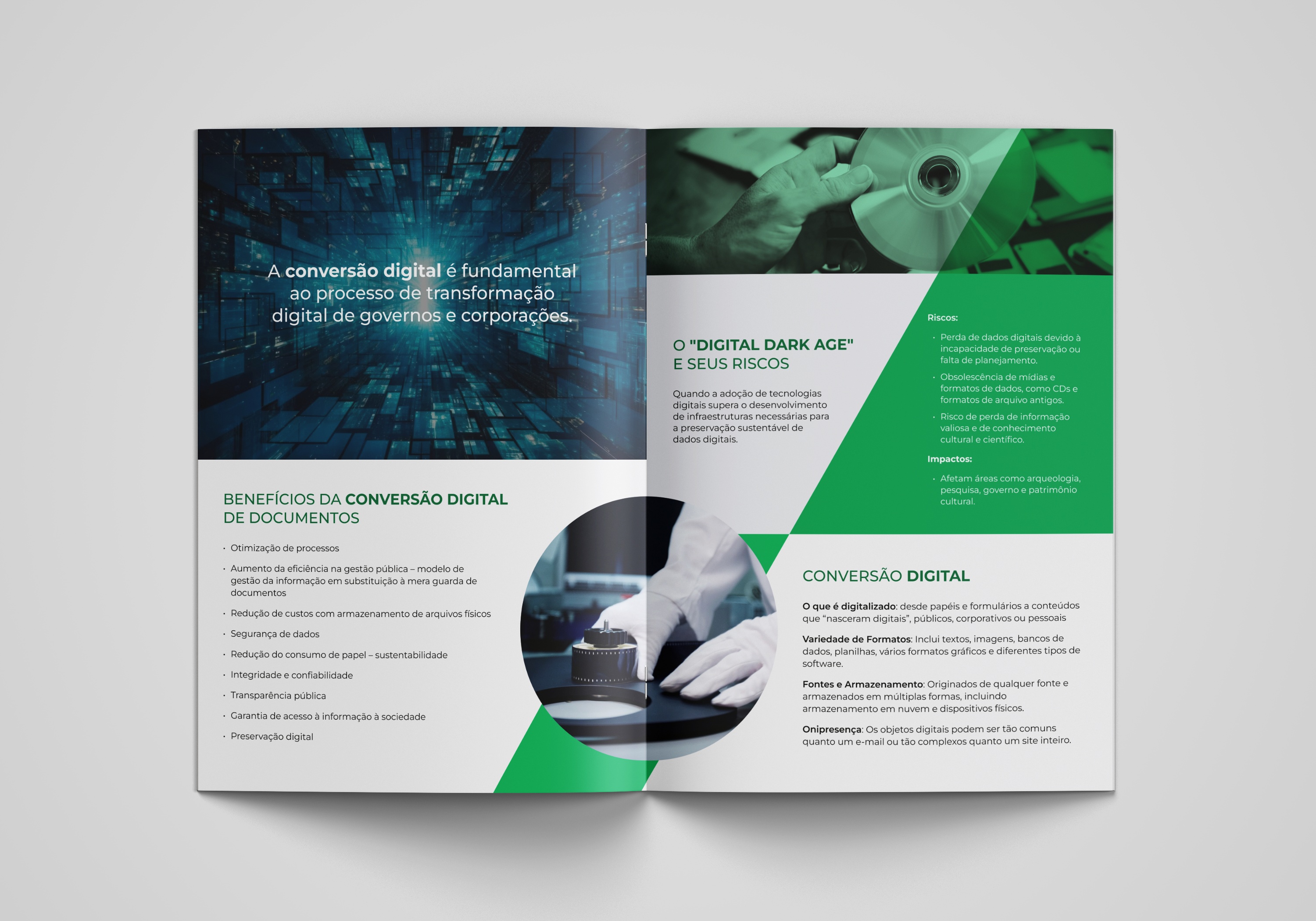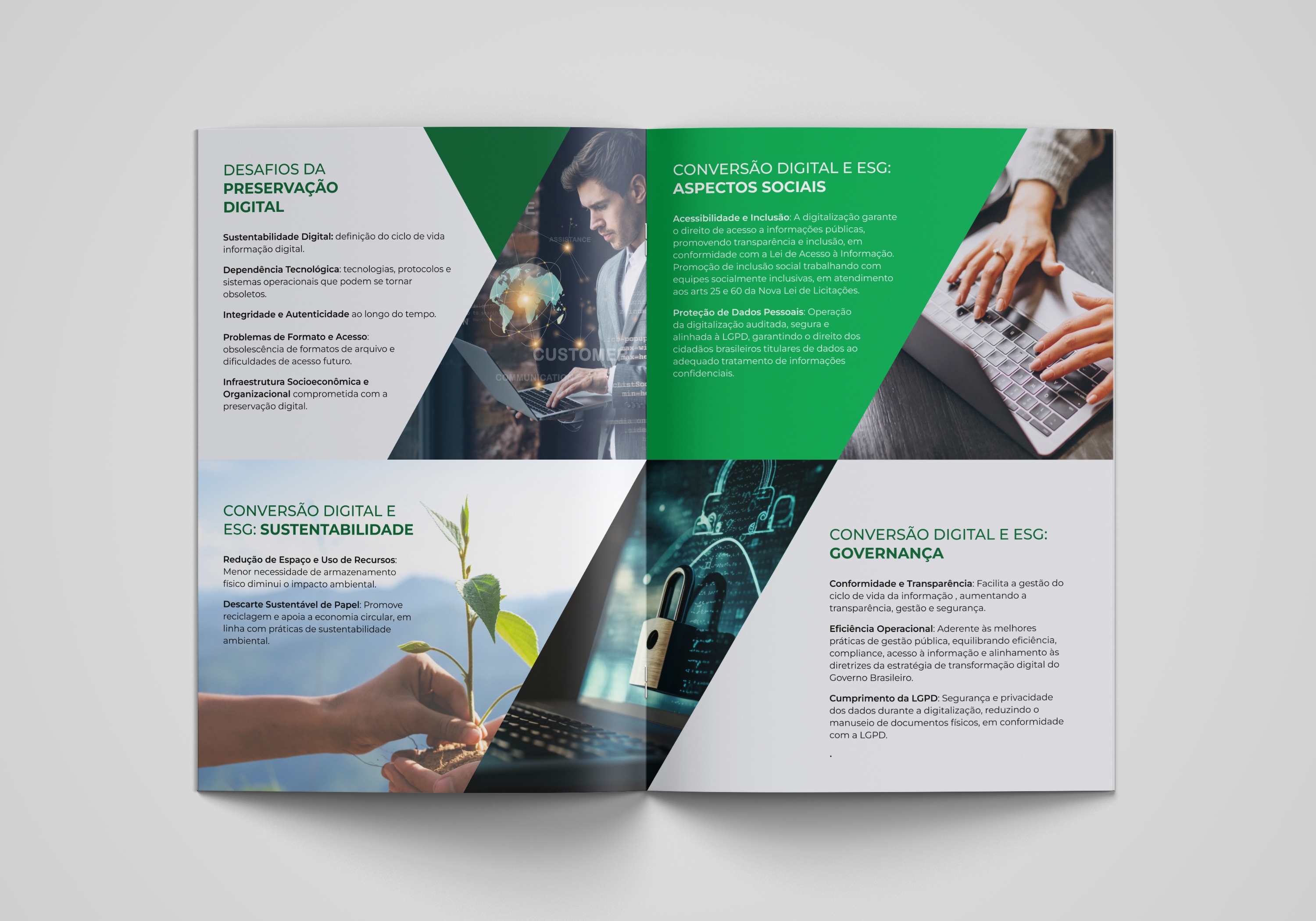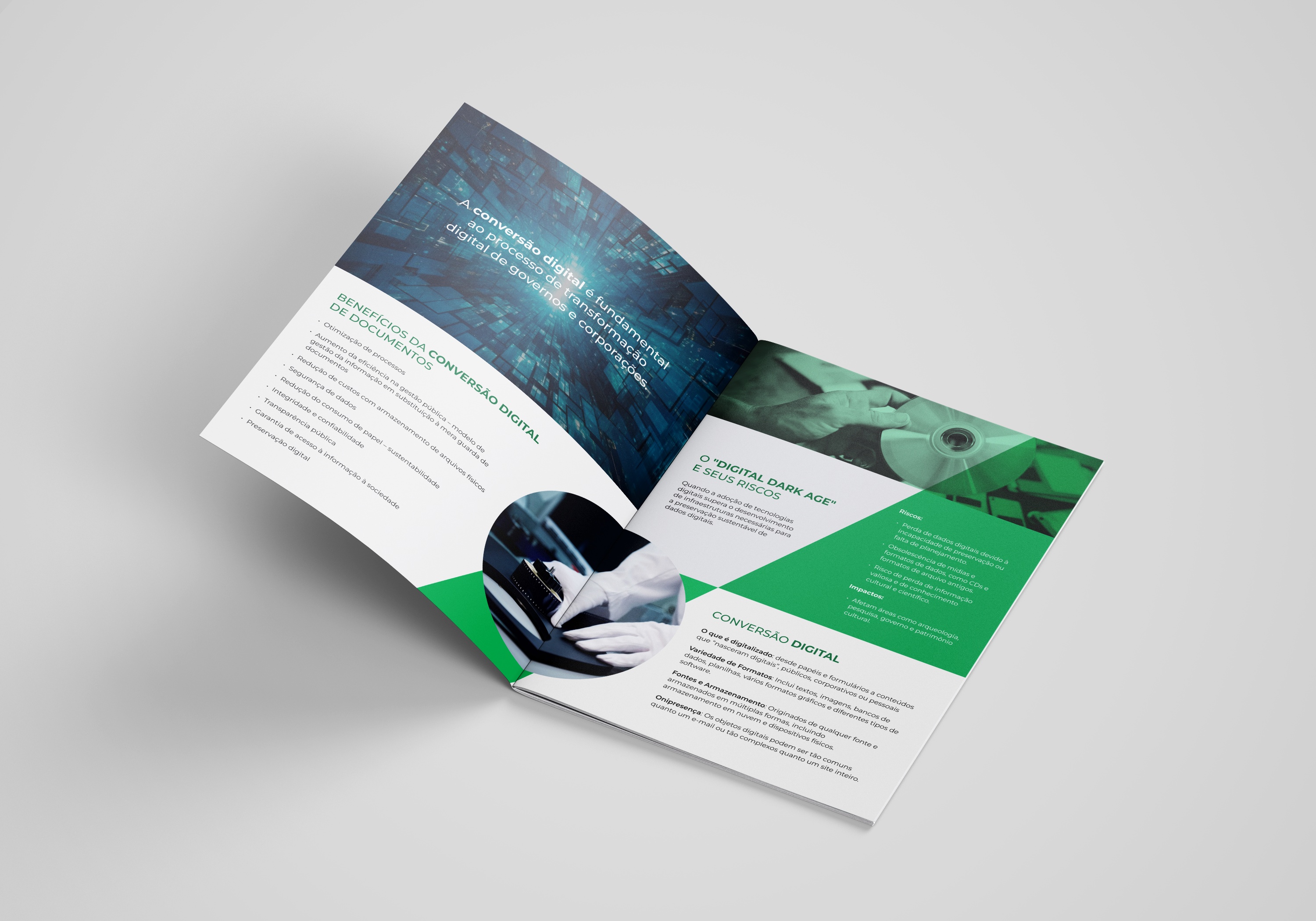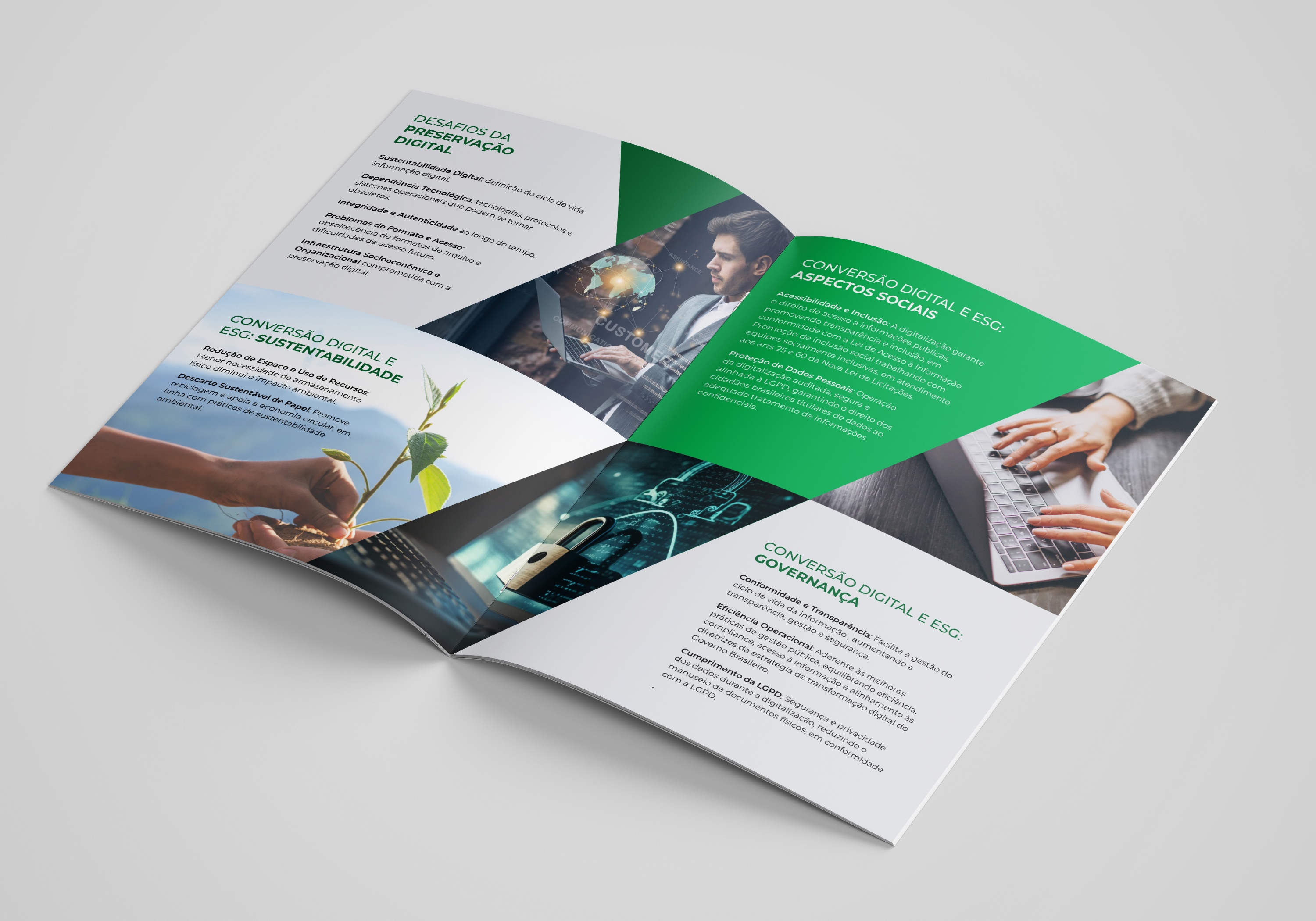 O material foi pensado para unir clareza técnica e estética editorial, traduzindo temas complexos — como digitalização certificada, microfilmagem digital, conformidade com a LGPD e o Decreto 10.278/2020 — em uma narrativa visual fluida, moderna e acessível.
