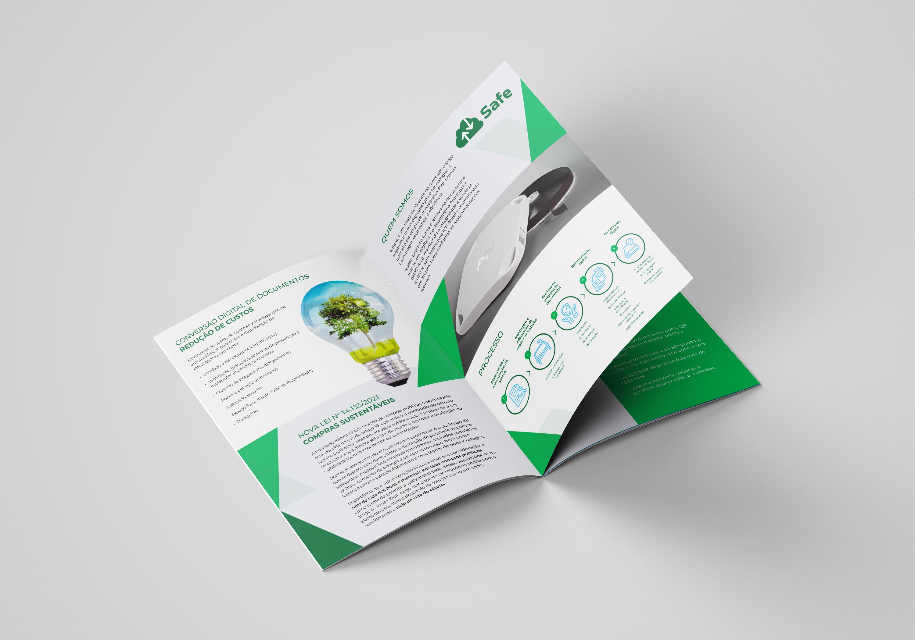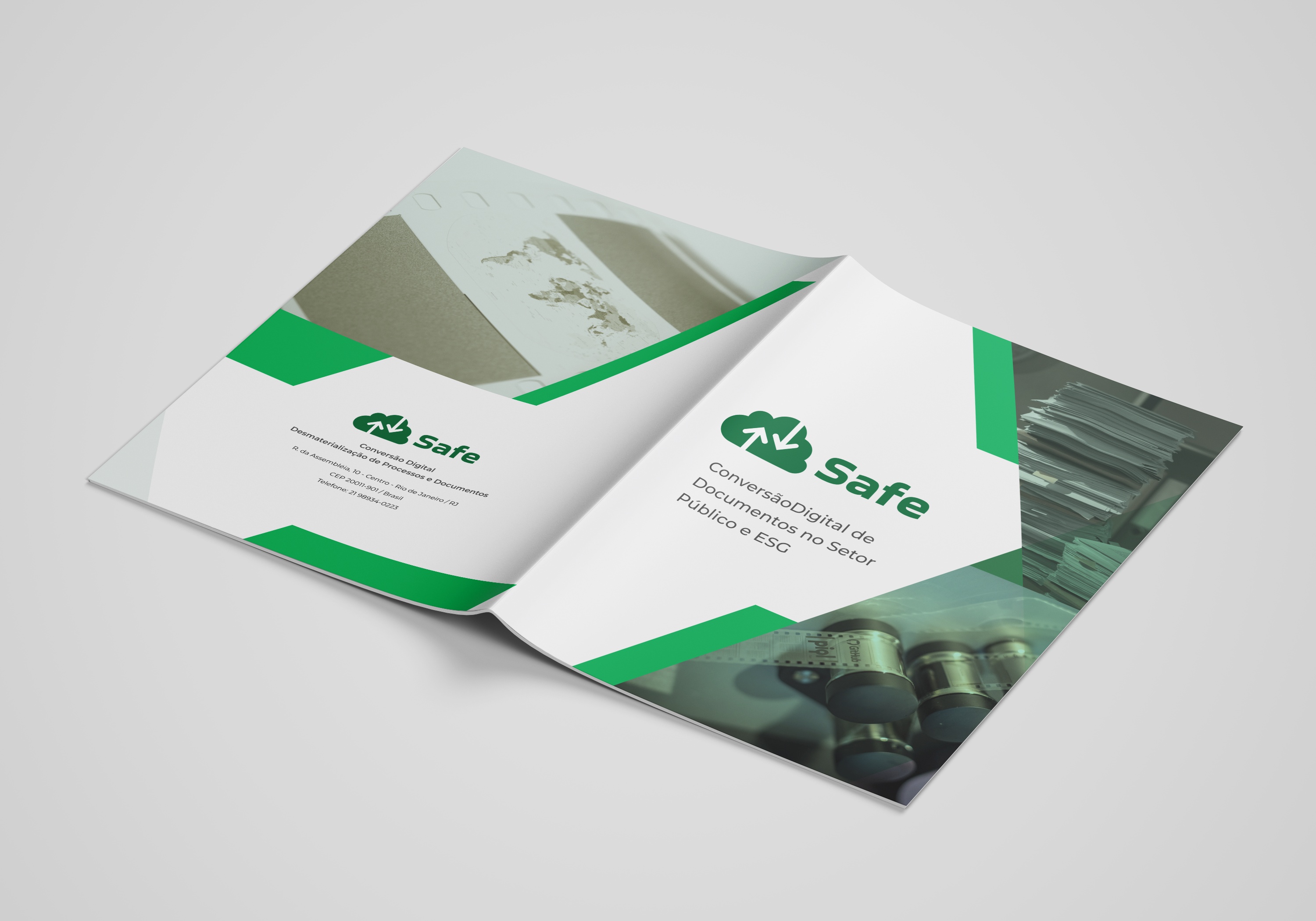 O resultado é um material institucional elegante e informativo, que reforça o posicionamento da Safe Digital como especialista em preservação digital e repositórios arquivísticos confiáveis (RDC-Arq) — transmitindo tecnologia, credibilidade e solidez em cada detalhe do design.